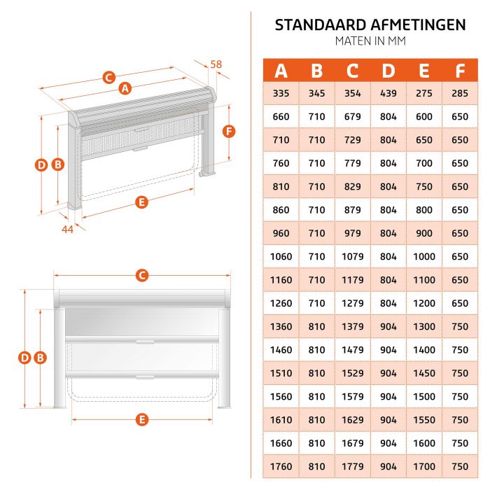 Om de juiste maat te vinden, hoeft u alleen maar de breedte van uw raam (maat E) te meten en de bijbehorende bestelmaat op te zoeken in de maattabel. Houd er rekening mee dat de Dometic Seitz Rastrollo 3000 in de breedte niet inkortbaar is, maar wel in de lengte/hoogte.