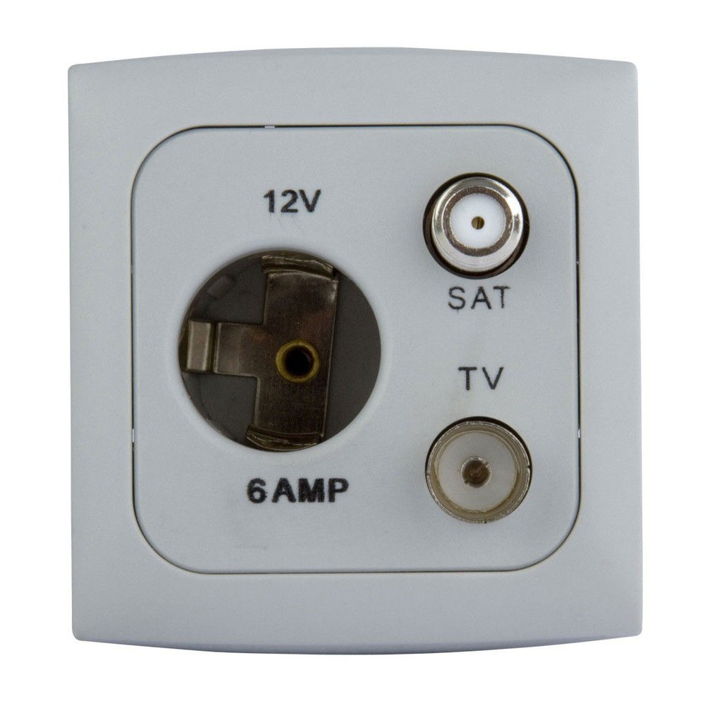 Deze wandcontactdoos met antenne en satelliet aansluiting heeft ook van een kleine 12 volt aansluiting.