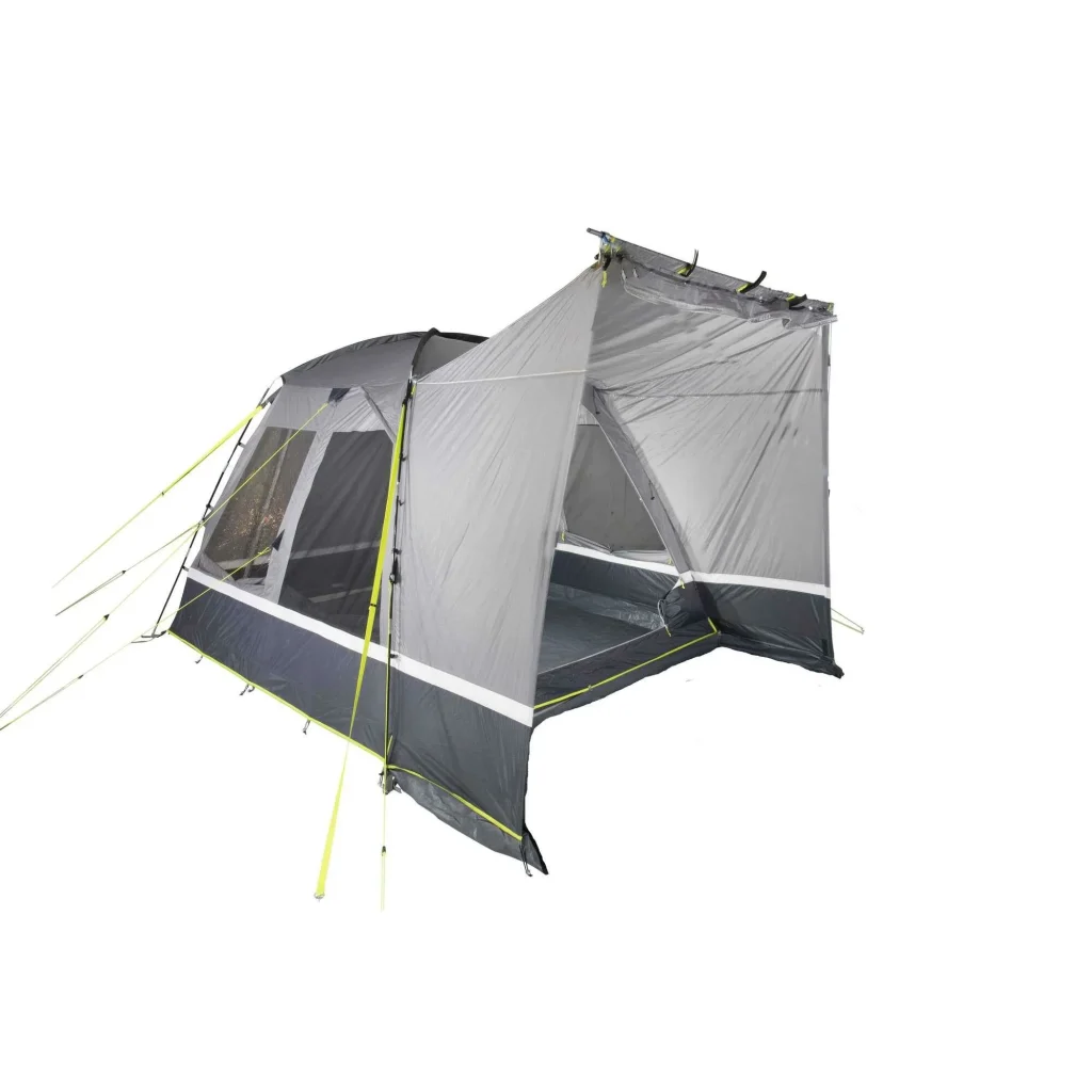 De Trentino 2.0 is niet zomaar een bustent – hij is gebouwd op duurzaamheid en comfort. Het vaste PE grondzeil is stevig aan de buitentent genaaid en beschermt effectief tegen vocht, tocht en vuil. Dankzij de opklapbare voorkant voorkom je struikelen bij het in- en uitstappen.