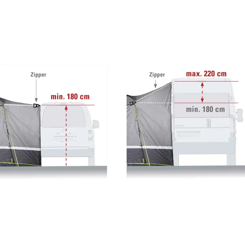 Dankzij deze opties is de Trentino 2.0 geschikt voor vrijwel elk voertuig met een aansluithoogte van 180 tot 220 cm. En doordat het een vrijstaande tent is, rijd je gemakkelijk weg zonder de tent af te breken.