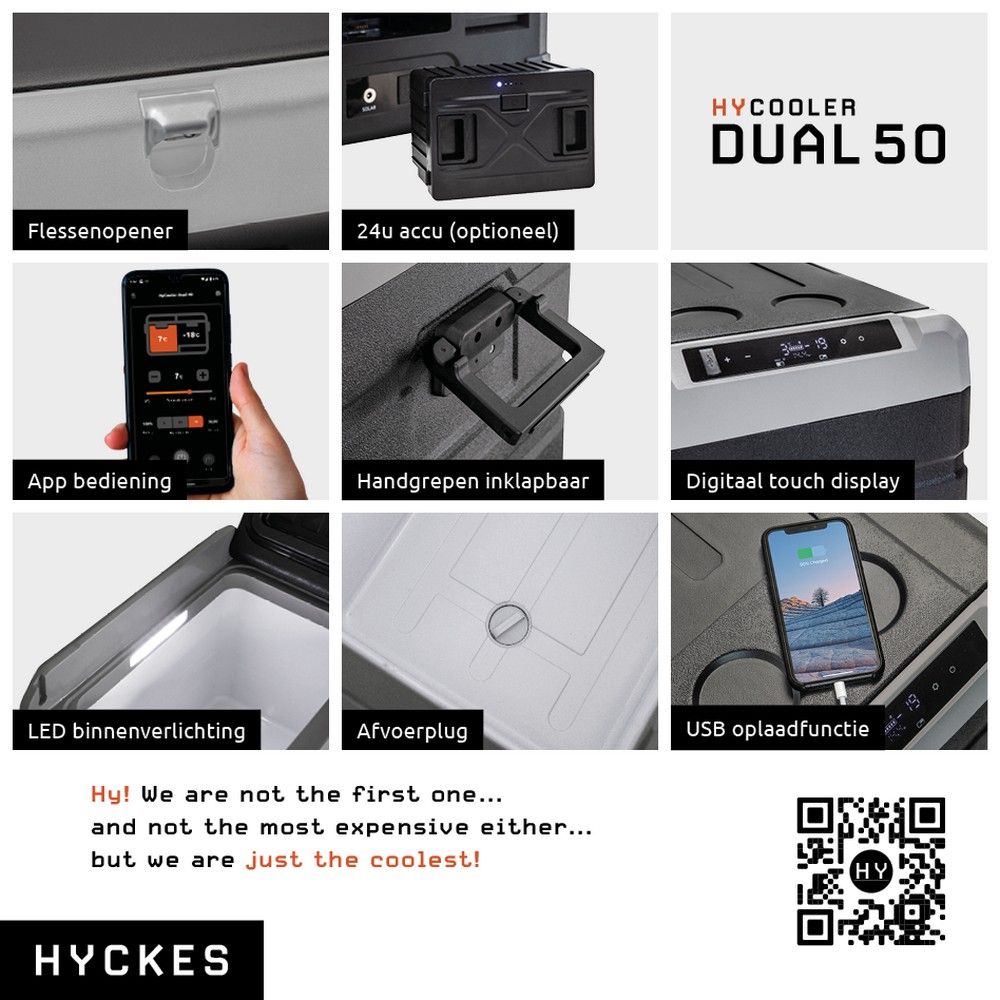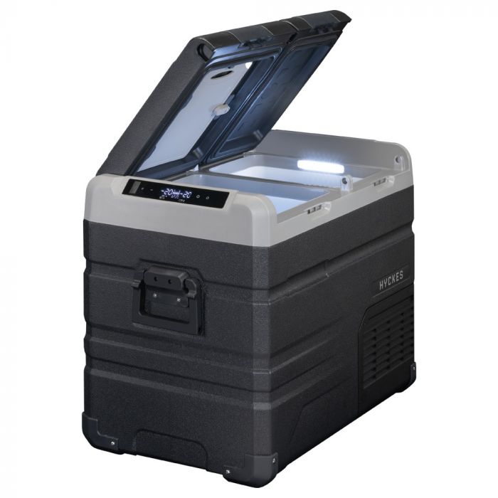 De Pro Dual 50 koelbox is voorzien van meerdere handige toepassingen. Beheer de koelbox eenvoudig via het digitale bedieningspaneel, die tevens een USB-oplaadpoort heeft. Of gebruik de Hyckes app om met uw mobiele apparaat de koelbox in te stellen. Verder heeft het interieur LED-verlichting, een afvoerplug en een afneembare snijplank. Aan de zijkant is een flesopener geplaatst en de deksel is omkeerbaar voor gemakkelijke toegang.