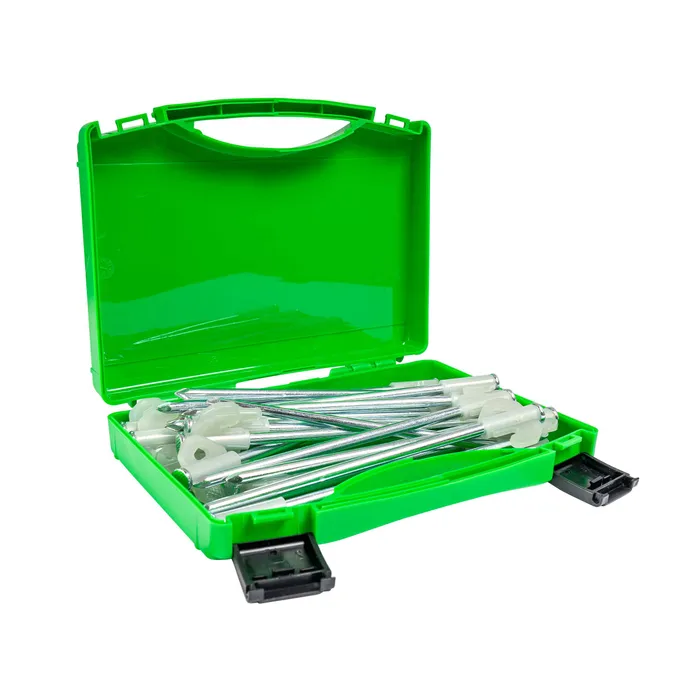 Deze set bestaat uit 20 robuuste rotspennen van staal met een diameter van 6,5 mm en een lengte van 20,3 cm – perfect om je tent of luifel stevig vast te zetten, zelfs op de meest uitdagende ondergronden. Of je nu kampeert in de bergen, op grind, op versteende kampeerplaatsen of in droge gebieden: deze rotspennen houden stand.