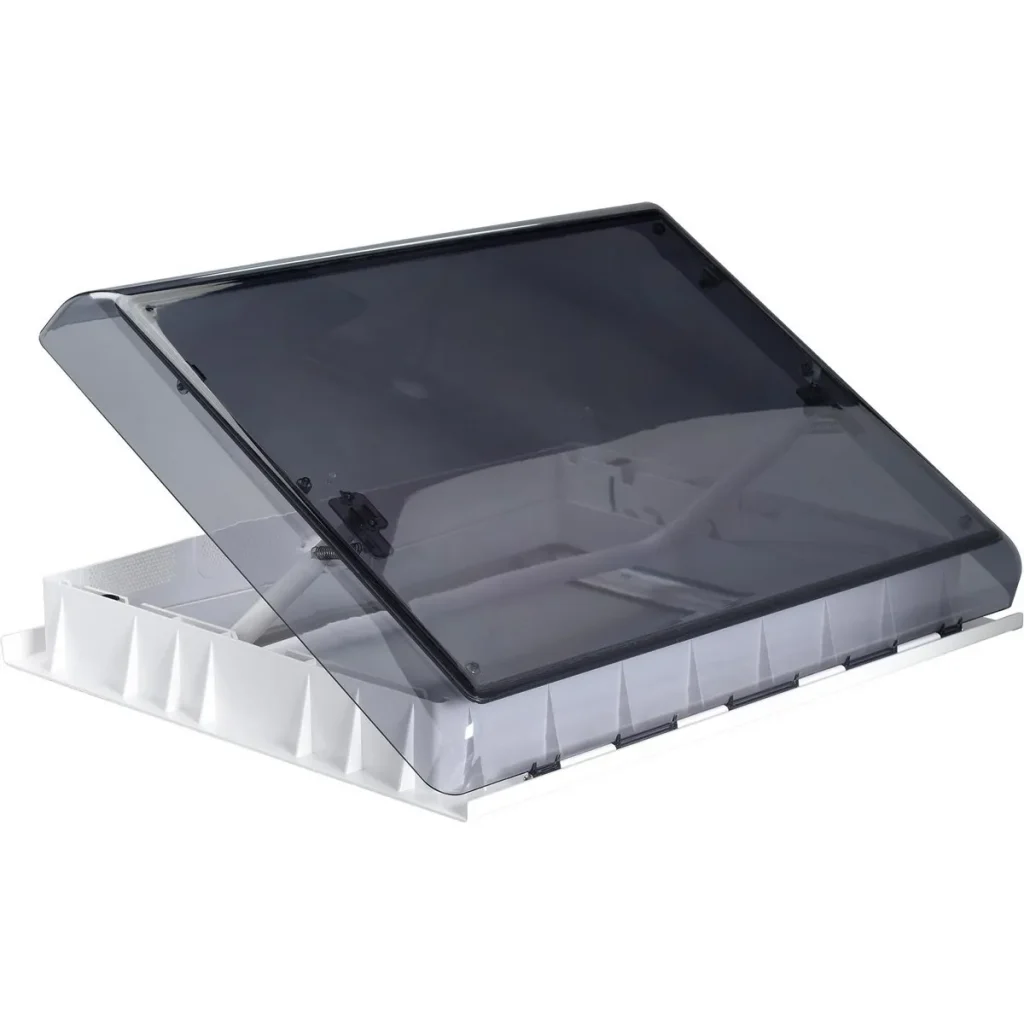 De strakke, moderne uitstraling van het dakluik sluit naadloos aan bij het interieur van hedendaagse caravans en campers. Het witte binnenframe en het zwart getinte deksel zorgen voor een stijlvol geheel dat niet misstaat in welk voertuig dan ook.