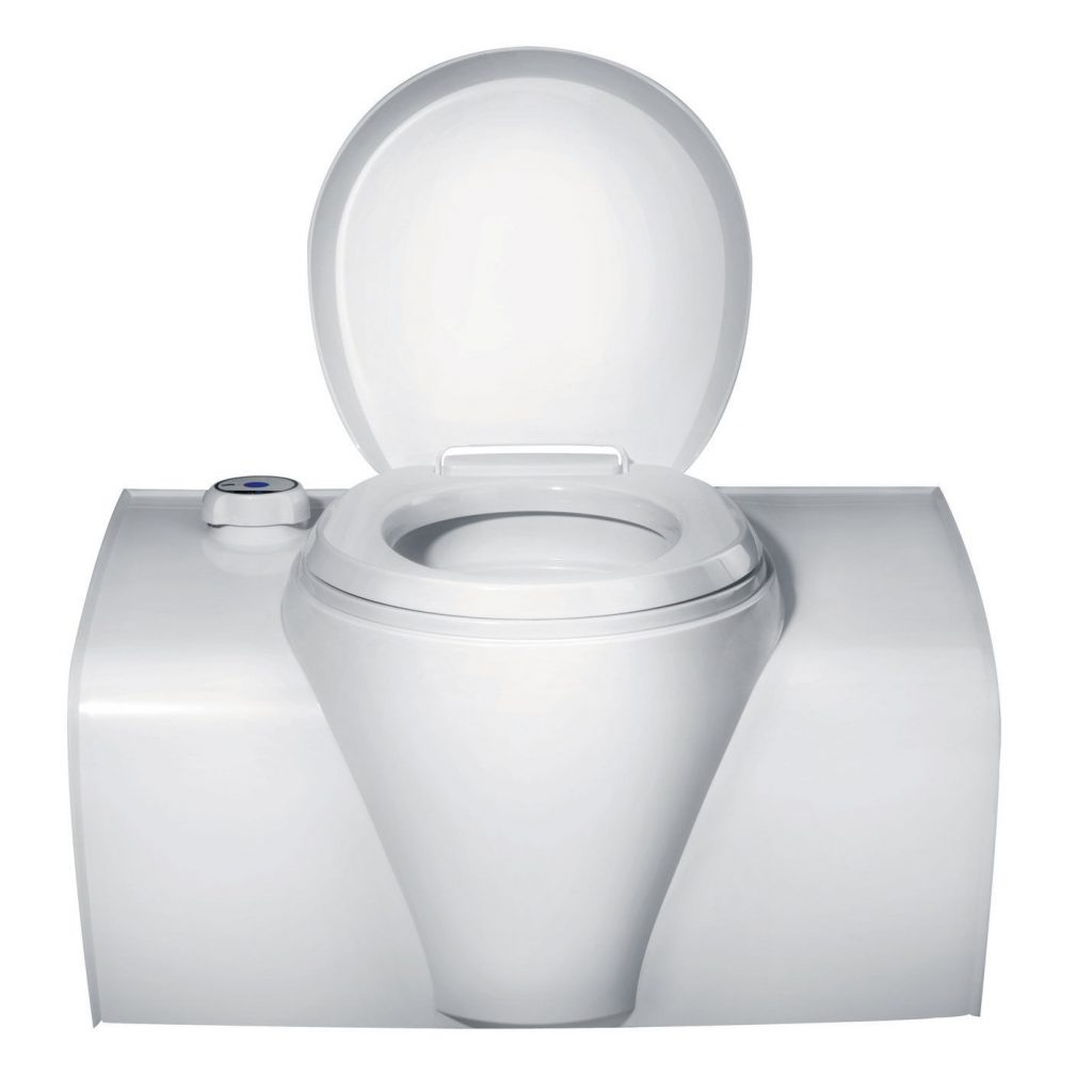 Elektrisch spoelsysteem. Heeft geen eigen watertank. Afvaltank heeft een capaciteit van 19,7 ltr.