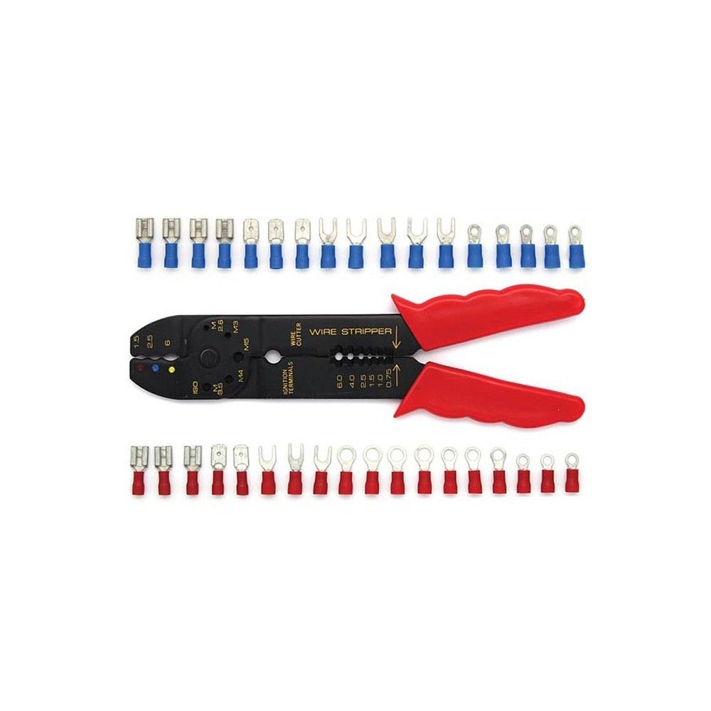Dit pakket bevat naast een krimptang tevens 80 stuks kabelschoenen. De krimptang voorbedrukt is met eenheden en maten.