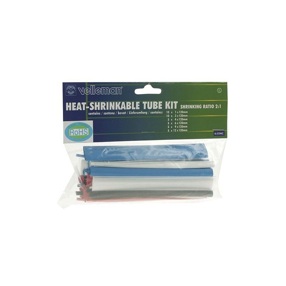 Elke set krimpkousjes is verpakt per 40 stuks en bevat:10 stuks van Ø1 x 120 mm10 stuks van Ø2 x 120 mm5 stuks van Ø4 x 120 mm5 stuks van Ø6 x 120 mm5 stuks van Ø9 x 120 mm5 stuks van Ø12 x 120 mm